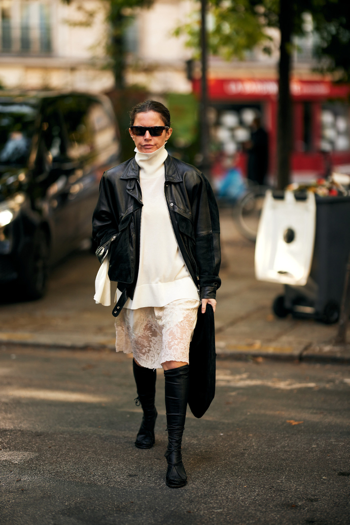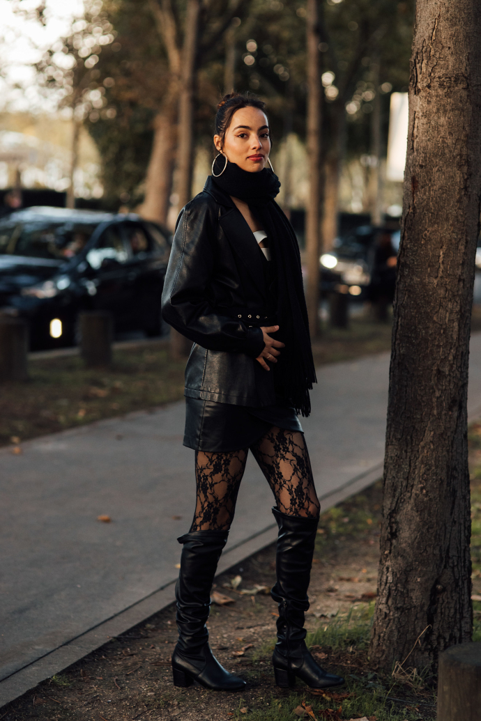 Ένας τρόπος να αναδείξεις τη sexy πλευρά της μαύρης μπότας είναι μέσα από leather ρούχα και δαντελένια καλσόν. Όπως στο παρακάτω σύνολο.