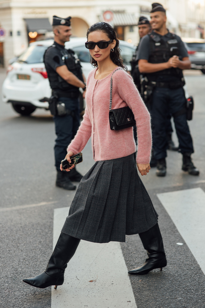 Η γραμμή της μίντι φούστας που καλύπτει το πάνω μέρος της μπότας δημιουργεί πάντα ένα ενδιαφέρον οπτικό εφέ. Είναι ένα combo που μπορείς να το δοκιμάσεις μέσα από διάφορους χρωματικούς συνδυασμούς όπως ο παρακάτω με γκρι φούστα και ροζ πλεκτό. Προσθέτεις ένα ζευγάρι μαύρες μπότες με χαμηλό τακούνι και είσαι έτοιμη.