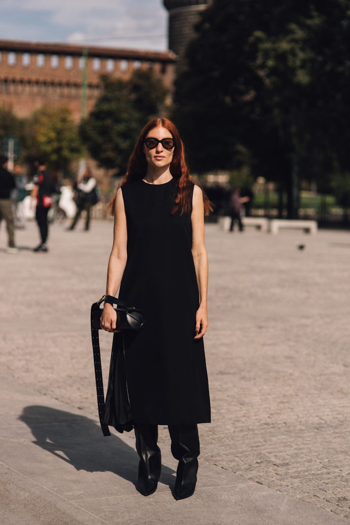 Οι καθαρές γραμμές του μινιμαλισμού αποτυπώνονται σε ένα ίσιο φόρεμα με καλοραμμένο design, μπότες με sculptural σχήμα και ένα μία μικρή κυλινδρική τσάντα.