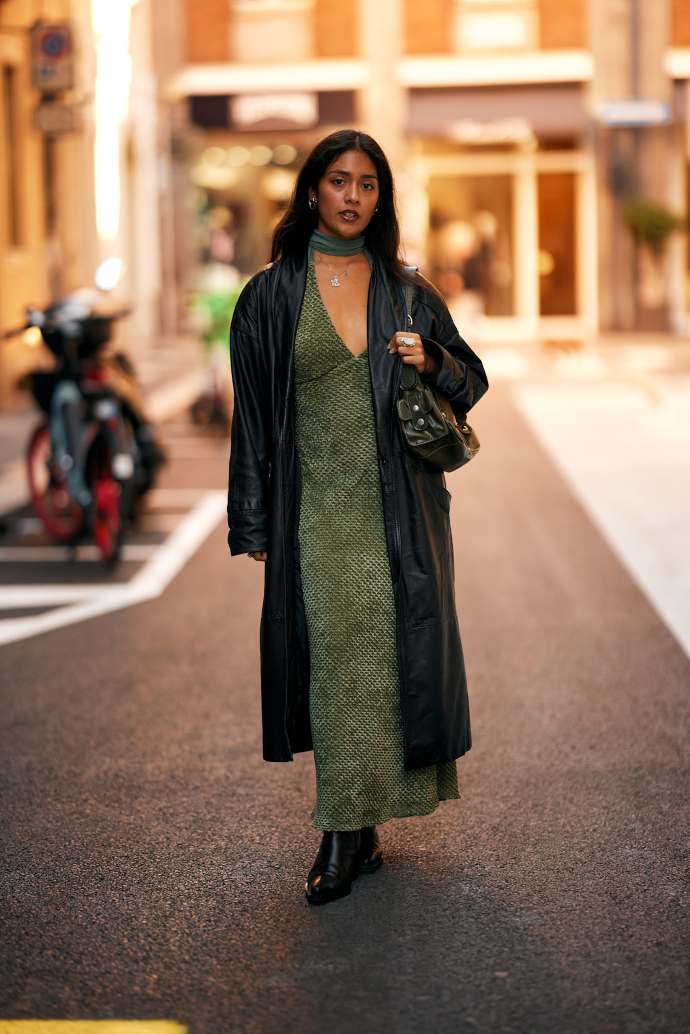 Αν σου έχει λείψει το halter neck φόρεμά σου μπορείς φυσικά να το φορέσεις από τώρα. Με ένα ζευγάρι μπότες και μία μάξι δερμάτινη καμπαρντίνα.
