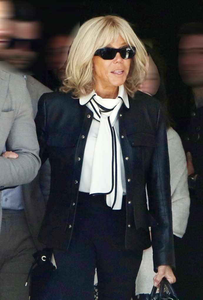 Ο φωτογραφικός φακός εντόπισε την Brigitte Macron με ένα μαύρο παντελόνι σε slim cigarette γραμμή το οποίο συνδύασε με ένα λευκό, μακρυμάνικο πουκάμισο με γιακά και έναν φιόγκο στο μπροστινό μέρος με λευκό και μαύρο συνδυασμό χρωμάτων.