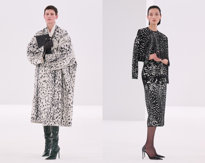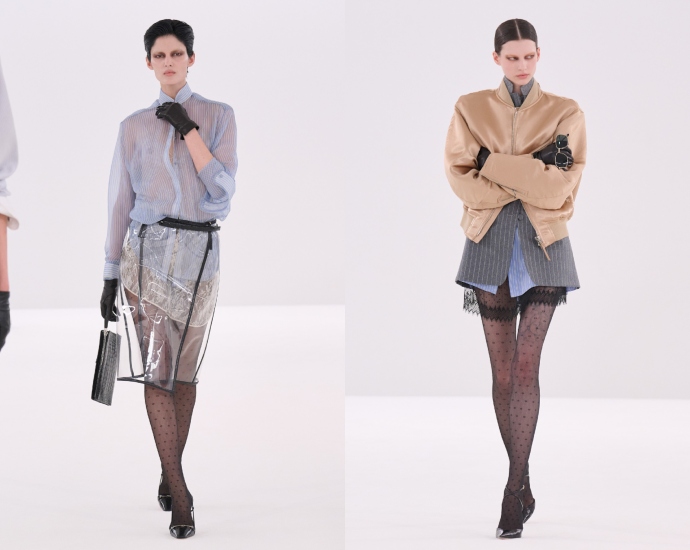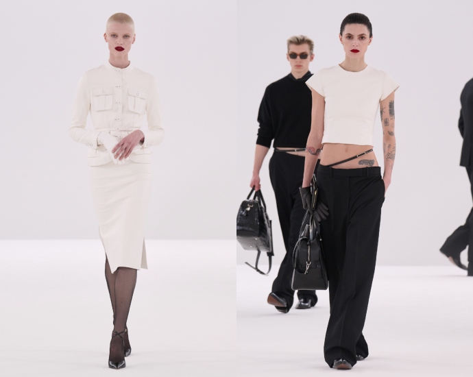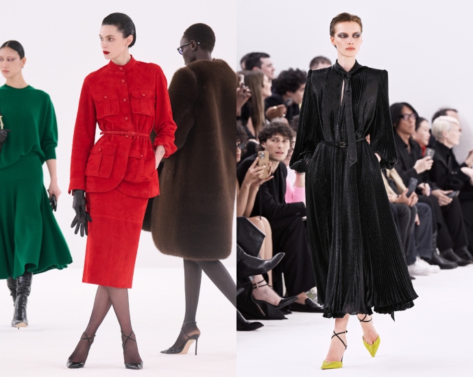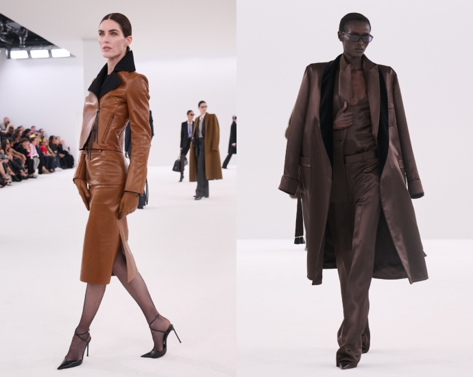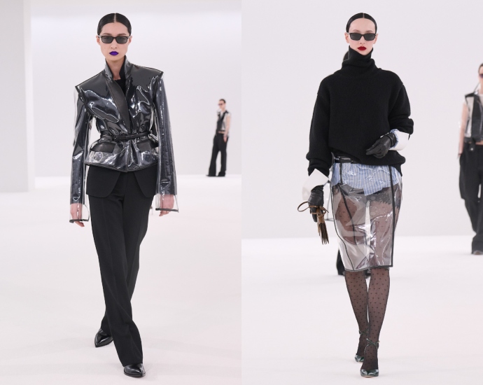 Οι σιλουέτες κινούνται ανάμεσα σε καθαρές γραμμές και ιδιαίτερους όγκους. Παλτό που αγκαλιάζουν το σώμα συνδυάζονται με στενά, αυστηρά κοστούμια, ενώ τα υλικά δημιουργούν τη δική τους ένταση: απαλό κασμίρι φοριέται με δέρμα -η άνεση τετ α τετ με την αυστηρότητα. Το αποτέλεσμα είναι ρούχα που μοιάζουν οικεία αλλά ελαφρώς διαφορετικά από τα συνηθισμένα.