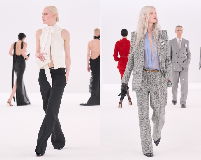 Στο επίκεντρο της συλλογής Tom Ford, βρίσκεται το tailoring. Το κοστούμι λειτουργεί ως βάση, πάνω στο οποίο ο Ackermann πειραματίζεται με τις αναλογίες, τις υφές και τα υλικά, όπως το PVC. Μικρές παραλλαγές στο design μεταμορφώνουν ένα κλασικό σύνολο σε κάτι απρόσμενο, χωρίς να χάνεται η αίσθηση της ανεπιτήδευτης κομψότητας και του sexiness που χαρακτηρίζουν τον οίκο.