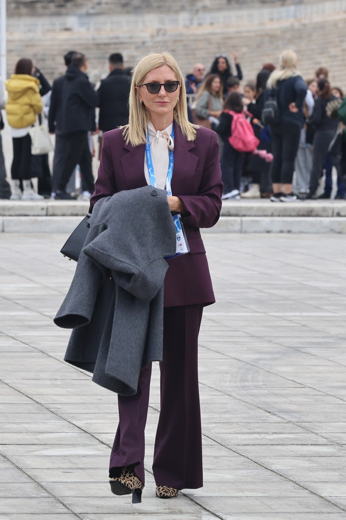 Η Marie Chantal επέλεξε αυτή του plum, συνοδεύοντάς το με ένα λευκό πουκάμισο με pussy bow και ένα ζευγάρι λεοπάρ μποτάκια του οίκου Khaite που κοστίζουν 1.650€ που έκαναν τη διαφορά στο σύνολό της.