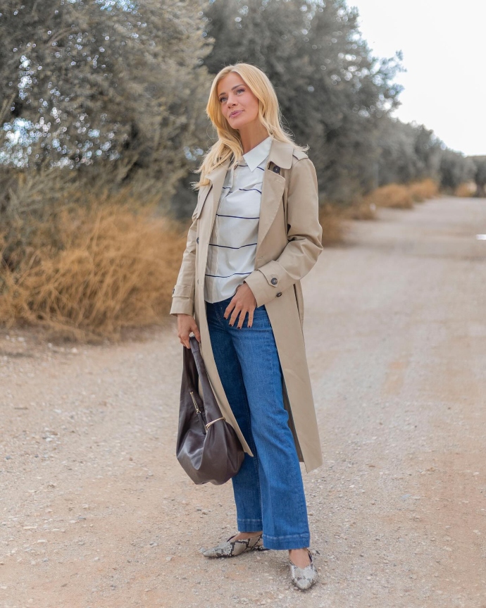 Η Ζέτα Μακρυπούλια δημιούργησε ένα πολύ εύκολο σύνολο που βασίστηκε στα καθημερινά staples. Φόρεσε το τζιν wide leg παντελόνι της με ένα ριγέ πουκάμισο στις αποχρώσεις του λευκού και του μπλε και το ολοκλήρωσε με την all time classic καμπαρντίνα σε μπεζ χρώμα. Η προσθήκη του snakeskin μοτίβου αναβάθμισε τα staple κομμάτια με έναν απλό τρόπο που μπορείς να δοκιμάσεις και στα δικά σου σύνολα.